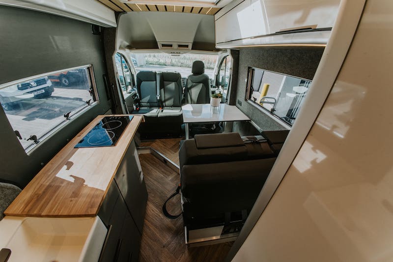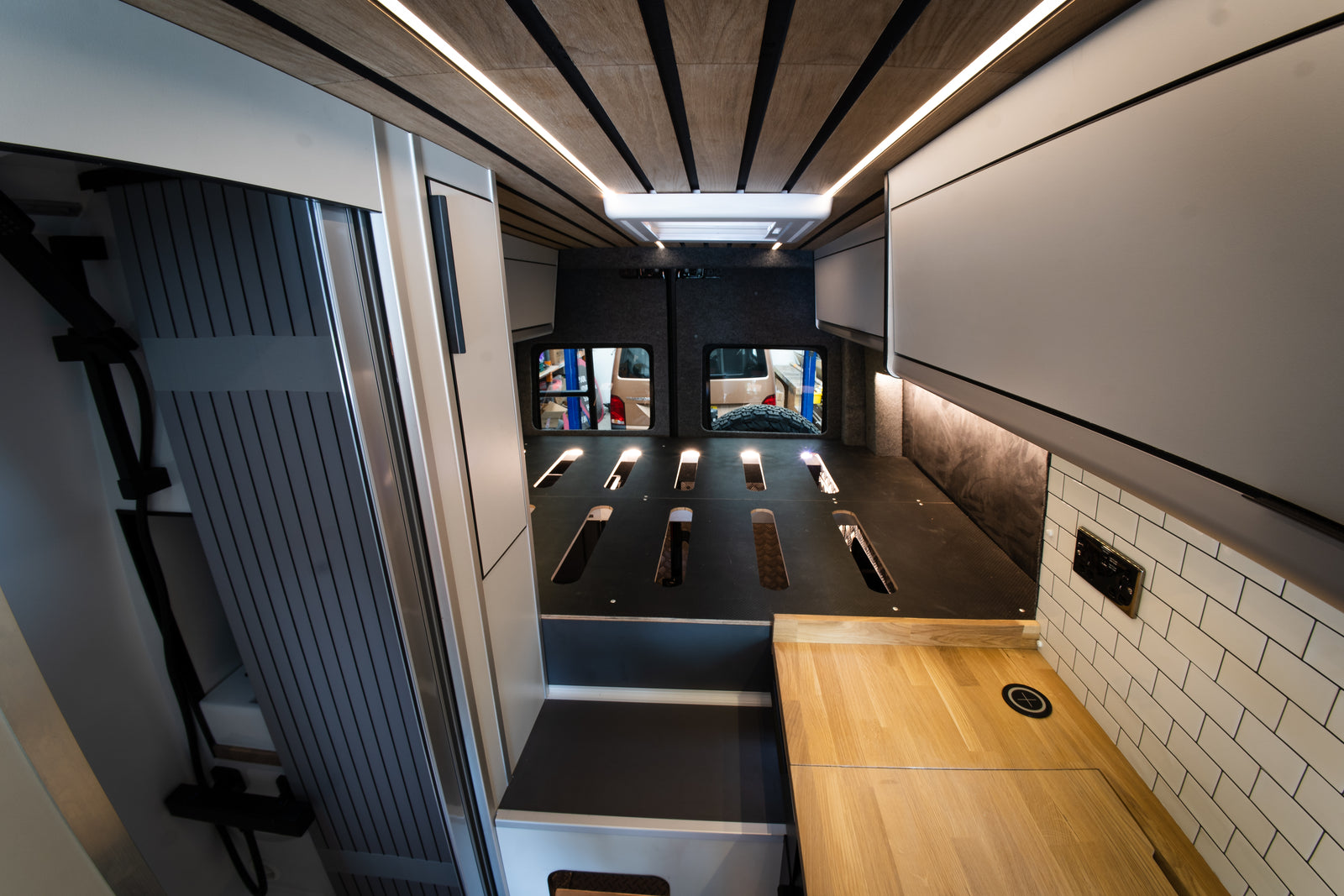 This conversion can be completed in the Crafter, MAN TGE or Mercedes Sprinter. Including top-of-the-line features such as a fully equipped kitchen. As well as a comfortable sleeping area and plenty of storage space.